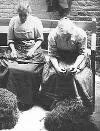 "Then I set to work to pick oakum. It was not the proper oakum, but coir fibre. I had to pick from ten ounces to one pound. It is an excellent meditative occupation. But it is hard at first on the finger-nails. Mine wanted trimming; for, if the nails are not short, the leverage on the nail in disentangling the fibre causes considerable suffering."10Oakum picking was introduced into prisons as a punishment for men in 1840: "...prisoners were given a weighed quantity of old rope cut into lengths equal to that of a hoop stick. Some of the pieces are white and sodden looking... others are hard and black with tar upon them. The prisoner takes up a length of junk and untwists it and when he has separated it into so many corkscrew strands, he further unrolls them by sliding them backwards and forwards on his knee with the palm of his hand until the meshes are loosened. The strand is further unravelled by placing it in the bends of a hook fastened to the knees and sawing it smartly to and fro which soon removes the tar and grates the fibres apart. In this condition, all that remains to be done is loosen the hemp by pulling it out like cotton wool, when the process is completed... The place is full of dust... the shoulders of the men are covered with brown dust almost as thick as the shirt front of a snuff taker... the hard rope cuts and blisters their fingers." 11 Oakum in Poor Houses